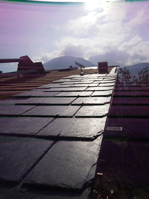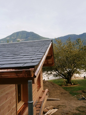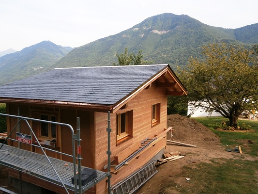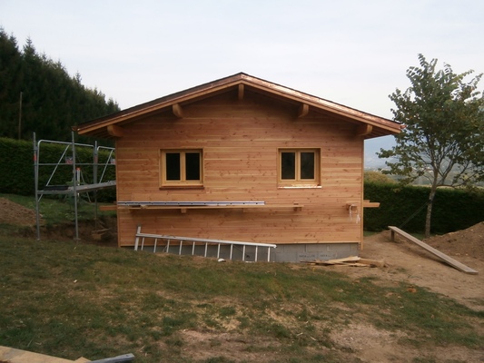 Description du projet : Abri basse consommation, ossature douglas 45/120, ouate de cellulose en remplissage, menuiseries bois double vitrage, bardage douglas, couverture en ardoises d'Espagne 1er choix, zinguerie cuivre