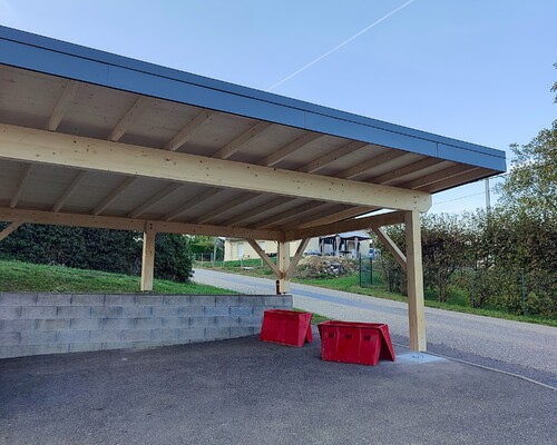 Description du projet : Abris voiture structure épicéa massif et couverture en bac acier + habillage en tôle laquée.