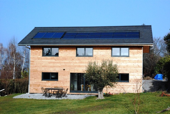 Maison basse consommation, ossature bois en épicéa massif en habillage d'une structure poteaux-poutres-dalles en béton, isolation thermique en laine de bois en façade et ouate de cellulose en remplissage, menuiseries extérieures bois-aluminium à double vitrage, bardage élégie en douglas, couverture en tuiles terre cuite, occultations par brises soleil orientables, test étanchéité à l’air.