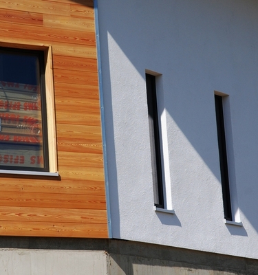 2 maisons basse consommation, ossature bois en épicéa massif, laine de bois extérieure en façade, habillage par bardage mélèze ou enduit.