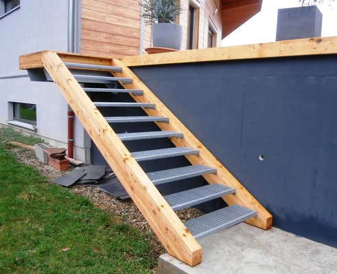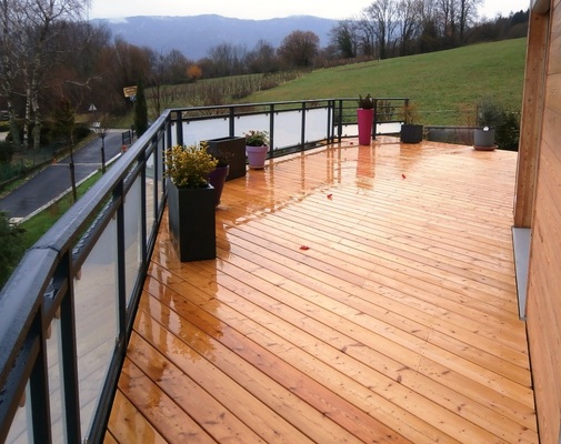 Pose d'une terrasse sur plots PVC réglables avec lambourdes en doglas et lames en mélèze et d'un garde corps en aluminium et verre préfabriqué par la société boivin