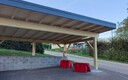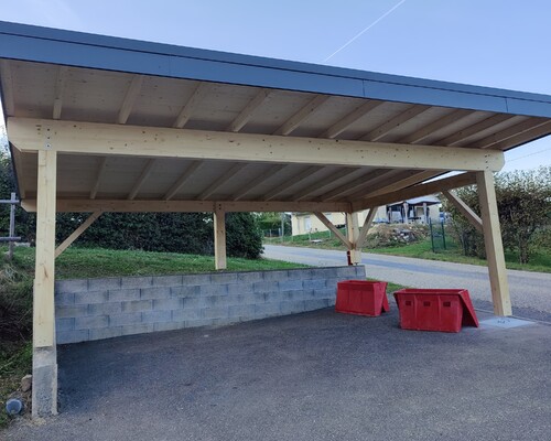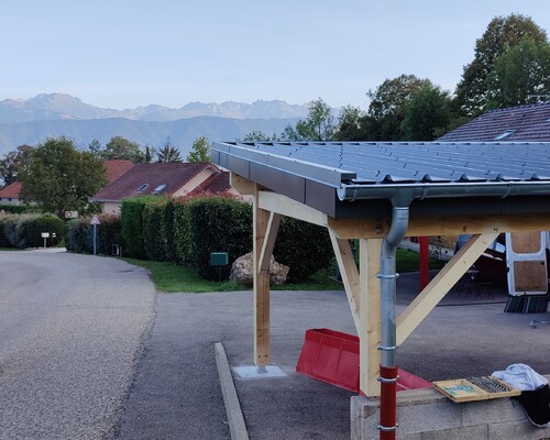 Description du projet : Abris voiture structure épicéa massif et couverture en bac acier + habillage en tôle laquée.